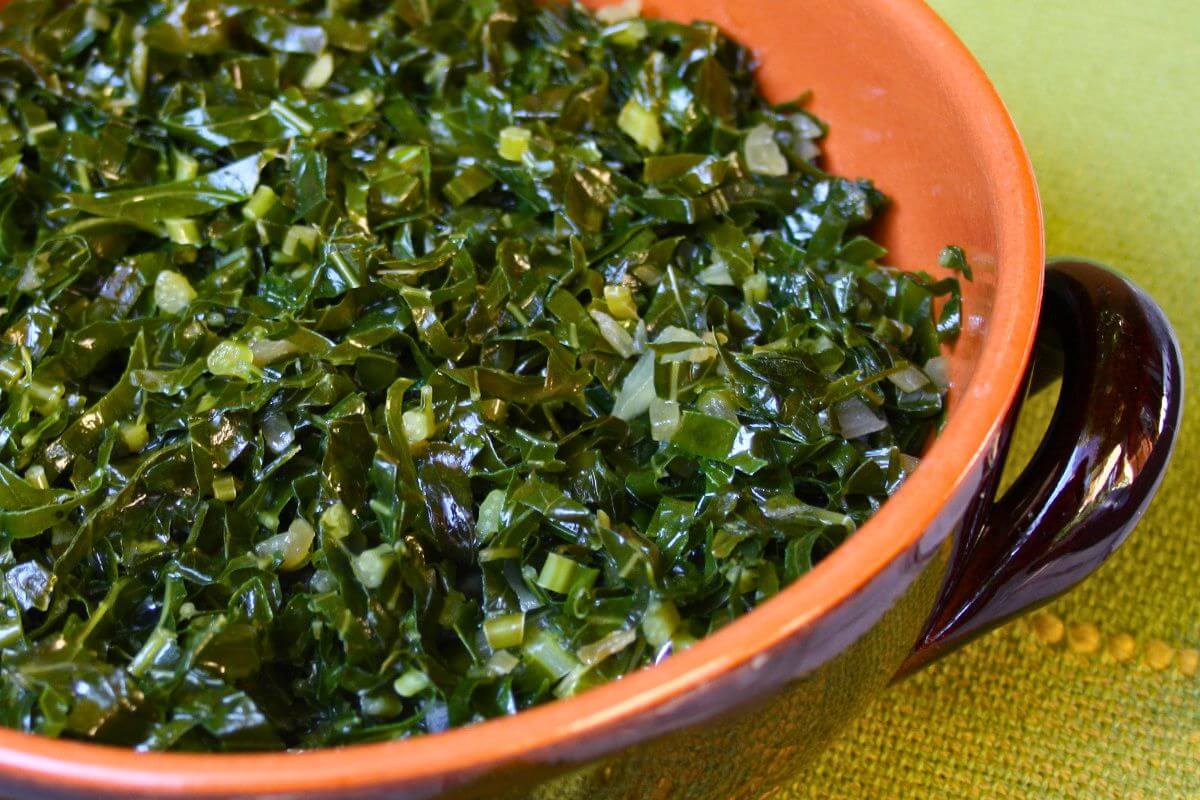 - Coloque as folhas picadas na panela e misture bem com o alho.